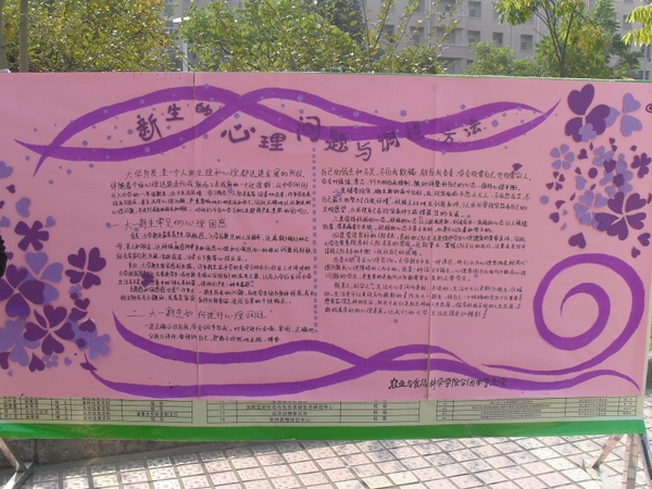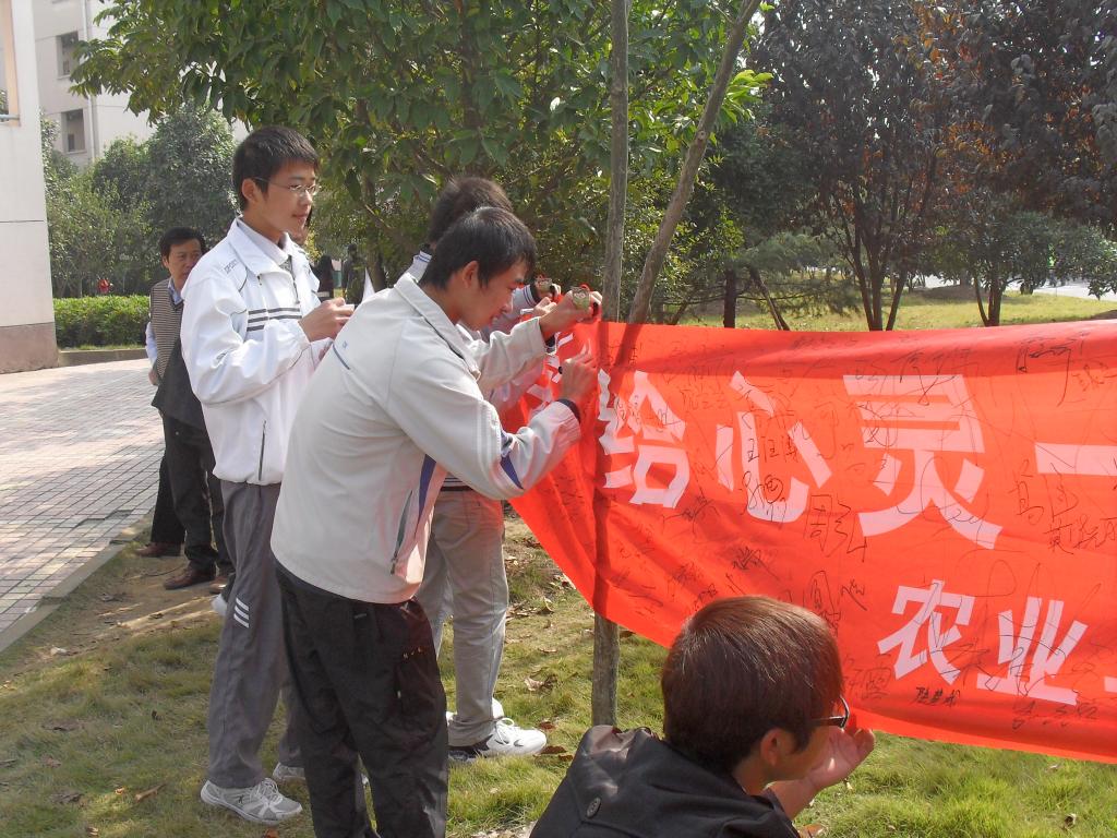 农业与食品科学学院学生会心理健康部举行了以“做阳光大学生,给心灵一片晴空”为主题的大型签名活动。活动通过展板、横幅、书签等形式向同学们展示了关于心理健康的一些信息内容,如学习如何避免心理问题、如何调试心理问题等。同学们仔细观看了这些相关内容与信息后,十分郑重地在横幅上签下了自己的名字。