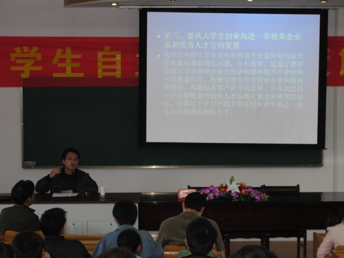 报告会上,胡佳毅从大学生创业的概念和如何进一步提高对大学生创业的认识方面入手,阐述了杭州市关于大学生创业工作中的一些政策和措施,解读了杭州市大学生创业工作中完善的政策体系、多位一体的帮扶体系、周到完备的服务体系等方面内容。最后,胡佳毅还与大家一同分享了杭州市大学生创业工作的经验和成效。