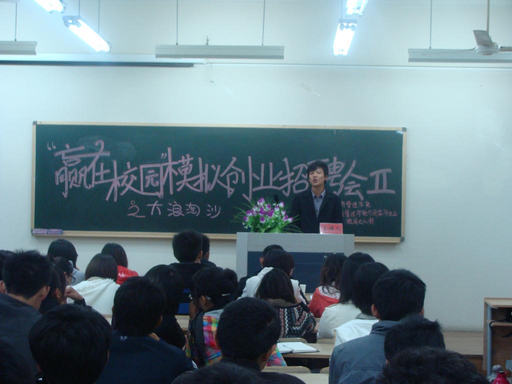 10月30日晚,由经济管理学院主办的第二届“赢在校园”模拟创业招聘会之大浪淘沙在教1201举行。模拟招聘会旨在让缺乏实践经验的大学生在就业形势严峻的情况下,了解招聘礼仪,积累面试技巧,提升应变能力,增强自身软实力。