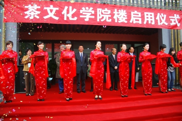 周国富宣布茶文化学院楼启用,徐鸿道、宣勇致辞,中国国际茶文化研究会副会长沈才土、中国国际茶文化研究会高级顾问杨招棣、中国国际茶文化研究会副秘书长黄书孟等三位同志寄语大学生,茶文化学院学生代表徐晴致答谢词,首届毕业生代表向茶文化学院赠送“廉、美、和、敬”四字牌匾,中国国际茶文化研究会领导、学校领导、临安市领导和师生代表进行了剪彩活动。仪式由副校长张立钦主持。