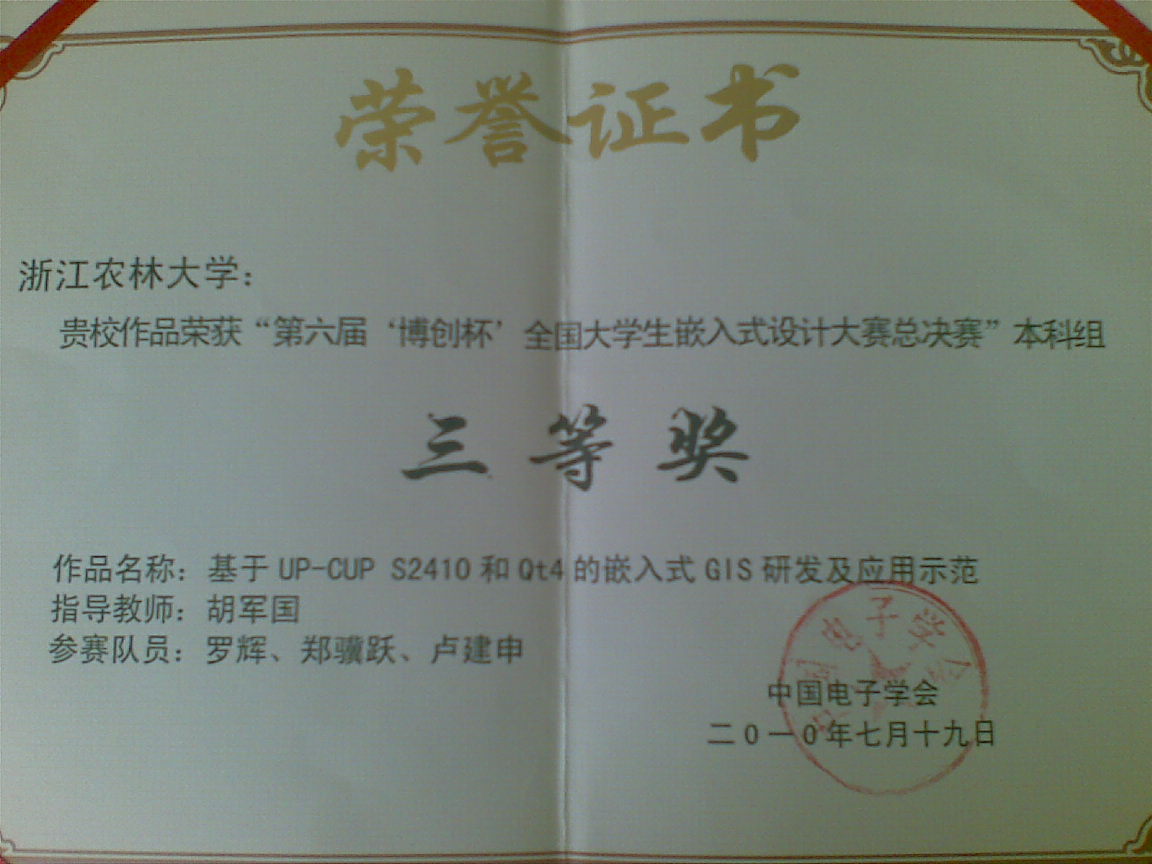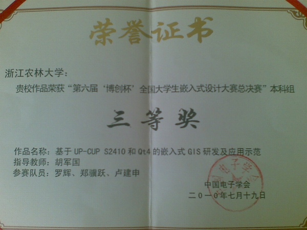 由中国电子学会主办,中国电子学会嵌入式专家委员会和中国农业大学共同承办的第六届“博创杯”全国大学生嵌入式设计大赛全国总决赛结果揭晓。BEAT365信息工程学院参赛作品《基于UP-CUP S2410和Qt4的嵌入式GIS研发及应用示范》在胡军国、祁亨年老师的指导下通过华东地区预赛,最终荣获三等奖。参赛队伍由计算机科学与技术系2007级罗辉和2008级的郑骥跃、卢建申3名学生组成。