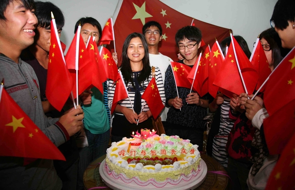 9月28日下午,天目学院学生会组织了11位在10月1日国庆节出生的学子齐聚图书馆休闲吧,开展了以“我与祖国共庆生”为主题的迎国庆创意活动。同学们一起围绕生日蛋糕,手挥五星红旗,歌唱爱国歌曲,共同祝贺祖国61周年诞辰。他们高涨的热情激发了众多前来观看的同学,让更多的人参与到了迎国庆活动之中。这些与祖国同生日的同学很多国庆节将在学校度过,本次活动的开展让他们感受到了学院家的温暖,同时也表达了天目学子对祖国最深切的祝福。