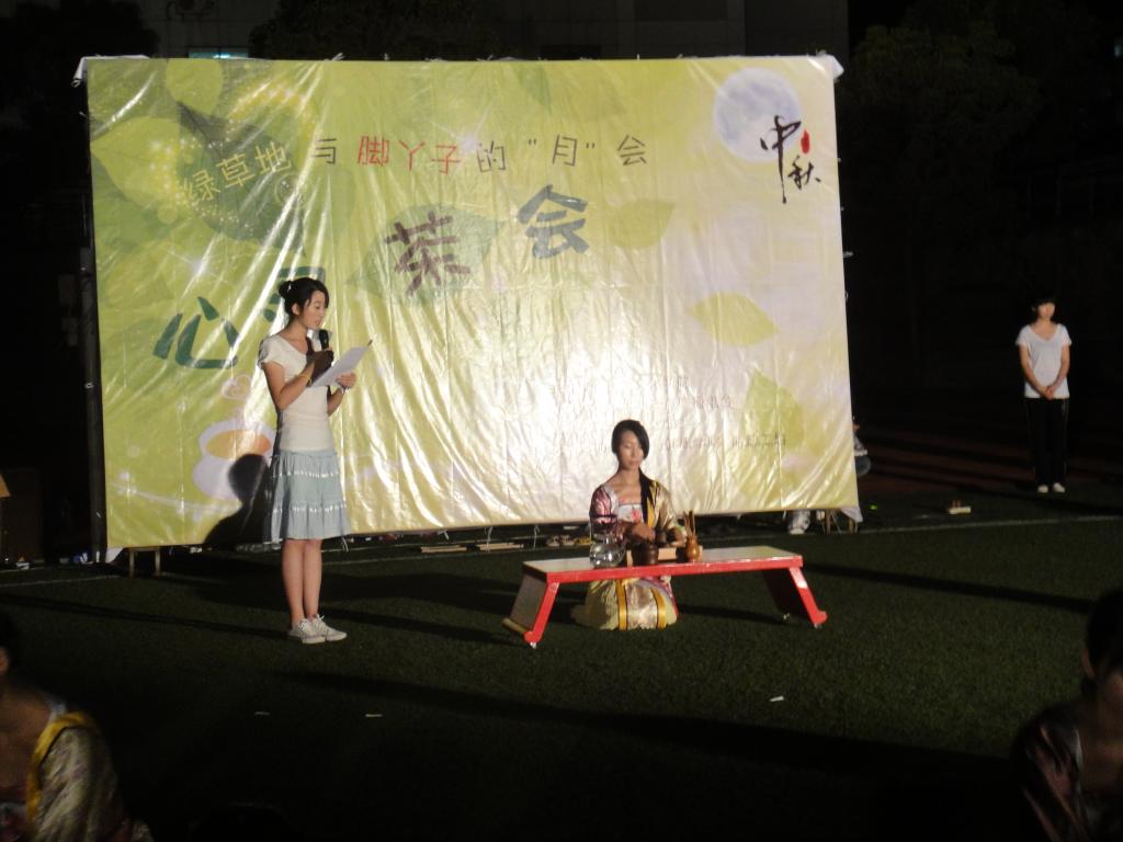 本次茶会在以往茶艺表演和品茗的基础上,新增添了灯谜、歌曲、小品、竞猜(月月欲试——关于中秋的字谜,茶的小知识)、舞蹈、瑜伽等节目。丰富多彩的节目不仅增强了茶会的可观赏性,更贴近于“茶为时尚饮”的主旨,也使大家在时尚与传统的碰撞中获得不一样的心灵感悟和净化。“心灵茶会”的茶艺表演由茶文化专业的同学们带来。他们身着汉服在月夜下冲泡一杯好茶,与观众共品香茗,在宣传茶文化、中秋文化的同时也宣传了汉文化,宣传了中国传统文化。