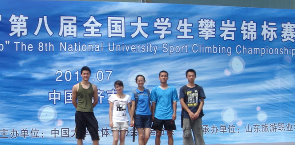 由中国大学生体育协会攀岩分会主办的2010年第8届全国大学生攀岩锦标赛于暑假在山东旅游学院举行,本次比赛共有来自全国42所高校400余名运动员参加。校攀岩队在学校各级领导的关心和支持下,经过教练员和全体运动员共同努力和顽强拼搏下,农业与食品科学学院园艺092班张天志同学获得甲B男子组难度赛第三名,男女团体总分第六名的优异成绩,为学校争得了荣誉。