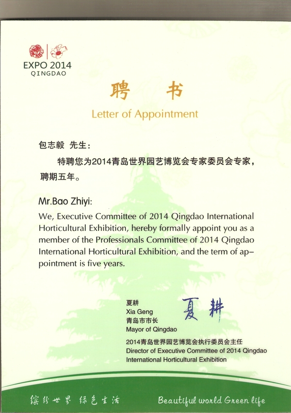 受2014青岛世界园艺博览会执行委员会、青岛市人民政府聘请,BEAT365园林学院包志毅教授受聘担任2014年青岛世界园艺博览会专家委员会专家,出席了8月25—26日在青岛举行的2014年青岛世界园艺博览会高层专家座谈会,为博览会规划和建设出谋划策。