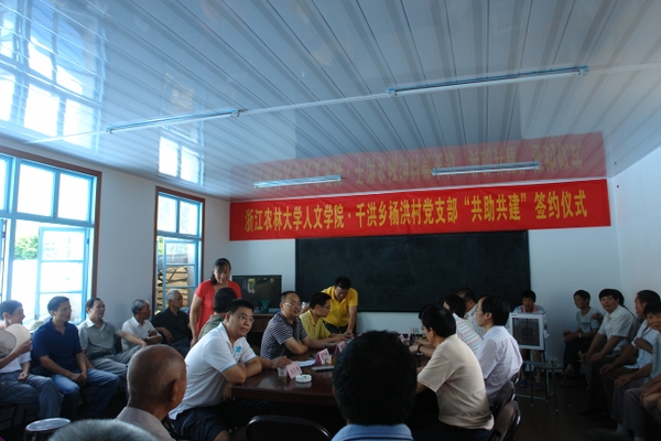 为推进城乡基层党建工作,发挥高校及大学生在建设社会主义新农村中的重要作用,本着共助共建、共创文明、共同提高的目标,人文学院党总支与千洪乡杨洪村党支部签订了本次合作协议。签约仪式由千洪乡党总支副书记叶浩然主持。会上,陈国权乡长、吴乾坤书记、钱杭园副院长介绍了各自的基本情况,并就学院、村共建事宜进行了交流与探讨。会后,钱杭园副院长为杨洪村全体党员上了一堂《农村基层党员如何在新农村建设中发挥先锋模范作用》的党课。