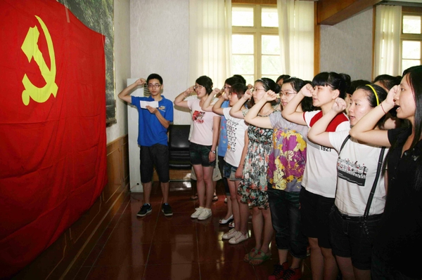 在鲜红的党旗下,学生党员们面向党旗,大声宣读入党誓词,重温自己一生当中光荣、神圣的一刻。他们手捧生日蛋糕,齐唱生日歌,共同庆祝中国共产党创建89周年。