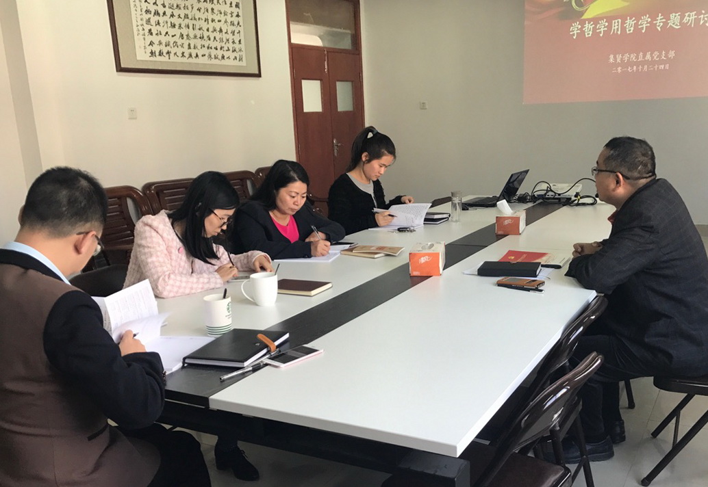十九大胜利闭幕之际,为纪念毛泽东同志《实践论》《矛盾论》发表80周年,10月24日下午,集贤学院直属党支部理论学习中心组召开专题学习会。会前,支部给教职工党员分发学习资料,在自学的基础上组织开展了学习讨论。