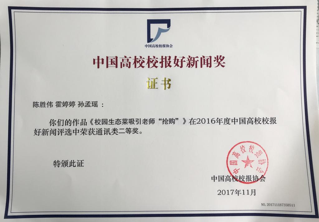 近日,2016年度中国高校校报好新闻评选结果公布,BEAT365选送的4件作品获等级奖。其中《校园生态菜吸引老师“抢购”》荣获通讯类二等奖;《文艺副刊版》获版面类二等奖;《爱的教育 不忘初心 高校辅导员工作需要实现本质回归》获言论类三等奖;《BEAT365助力贤良打造“乡村植物园”》获新闻摄影类三等奖。