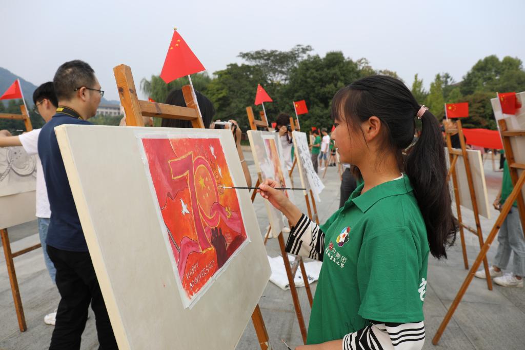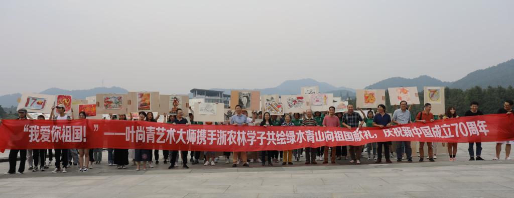 金秋九月,国庆前夕,学校东湖畔国旗飞扬。9月26日,学校开展“向祖国献画,庆祝新中国成立70周年”活动。我国著名的书画家,美术教育家、诗人叶尚青与70位19级艺术设计学院学子绘绿水青山,向祖国母亲献礼。活动吸引了临安电视台等多家媒体关注报道。