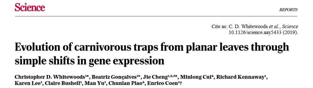近期,农业与食品科学学院崔敏龙教授与英国约翰•英纳斯中心(John Innes Centre)Enrico Coen教授研究团队在水生食虫植物丝叶狸藻(Utriculariagibba)的捕虫器【杯状叶或陷阱(trap)】生长发育机制研究方面取得重要进展。研究成果以“Shaping of a three-dimensional carnivorous trap through modulation of a planar growth mechanism”为题在《PLoS Biology》上发表,崔敏龙和Enrico Coen为共同通讯作者,朴春兰为参与者;另一篇以“Evolution of carnivorous traps from planar leaves through simple shifts in gene expression”为题在《Science》上发表,崔敏龙和朴春兰为参与者。