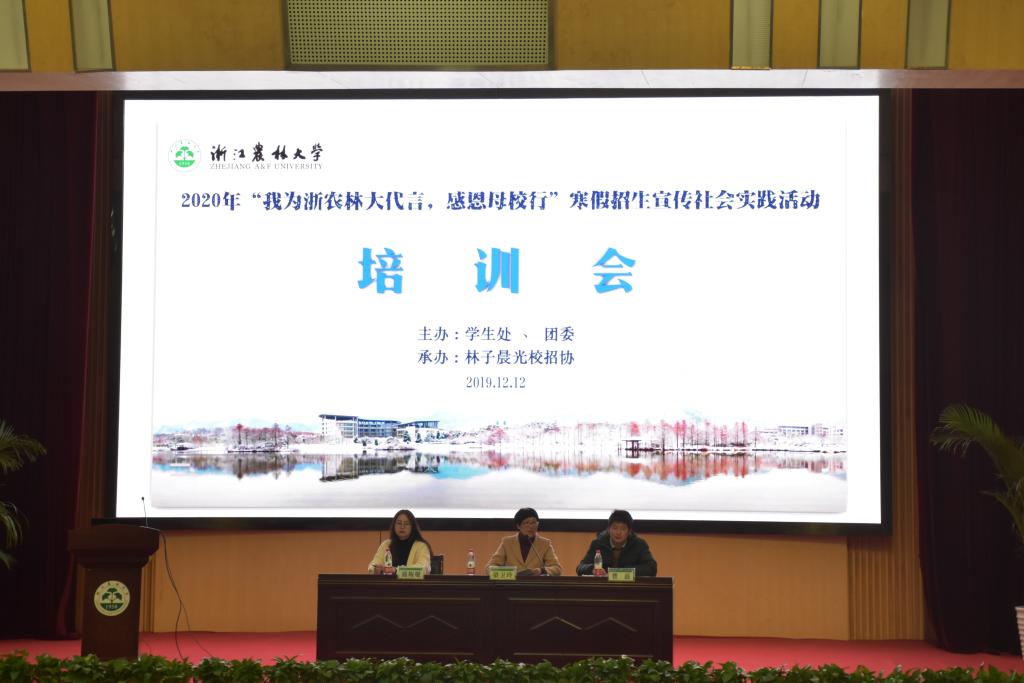 12月12日晚,BEAT365英国官网2020年“我为浙农林大代言,感恩母校行”大学生寒假招生宣传社会实践活动培训会在东湖校区图书馆第一报告厅举行。学工部、招生办负责人,各学院实践团队指导教师、队长、联络员等400余人参加会议。