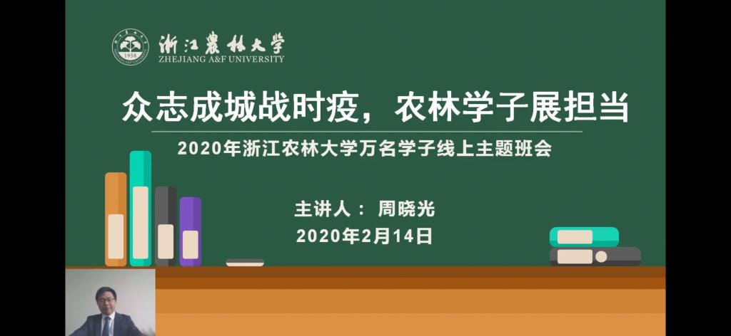 2月14日,学校万名本科生同开一堂主题为“众志成城抗时疫,农林学子展担当”的网络主题班会,主题班会由学工部部长、学生处处长周晓光主讲。据学校网络教学平台统计显示,截止当天18:00,全校本科生共12098人全程收看网络主题班会。
