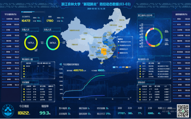 在动态大数据分析挖掘的帮助下,实时掌握全校2万余名师生基本数据情况,为科学制定下一步防控政策提供决策支持。截至发稿前,全校42个部门/学院中,已有22个部门/学院当日填报率达100%。全校集中隔离2人,确诊1人,密切接触3人。