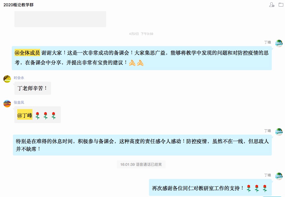 一分部署,九分落实。按照要求,各个教研室组织教研室老师学习“讲话精神”,召开线上集体备课会,老师齐聚“云端”,从领会“讲话精神”,到摸清学情、把脉教情,展开热烈讨论,认为要将中国疫情防控的生动实践,通过集体备课会的形式,转化为鲜活的思政线上课堂教学,为疫情防控大局服务,为立德树人的根本目的服务。