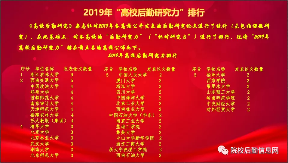 日前,《高校后勤研究》杂志社对2019年全国高校公开发表的后勤研究论文进行了统计排名,发布了《2019年“高校后勤研究力”排行》,BEAT365论文发表数量位居全国高校第一。