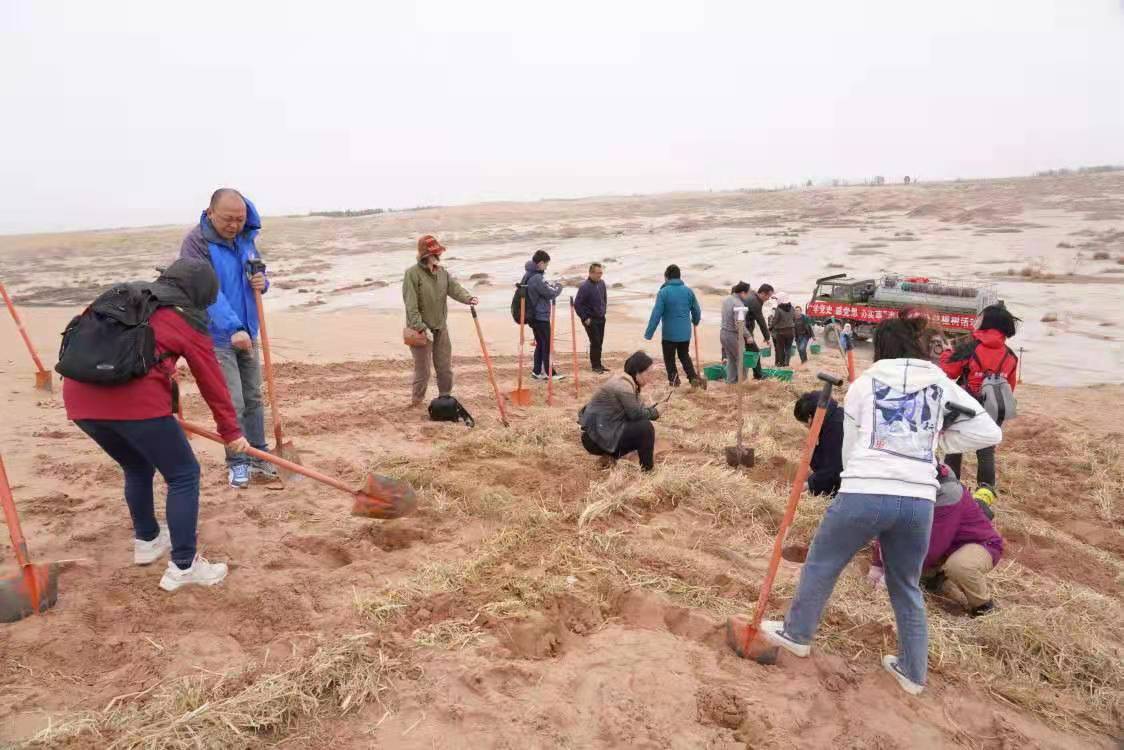 各支部代表和村民一起种植梭梭,这是大家第一次体验利用稻草做成方格沙障,再往中间种植梭梭的治沙种植方法,划沟、铺草、压沙、刨坑、放苗、浇水、掩土,这一整套流程,大家动作生疏却热切。看着过去十年援种的梭梭林,就像一片不断扩大的绿色之肺,顽强的阻挡这巴丹吉林沙漠和腾格里沙漠的合围,心中充满着希望和温暖。