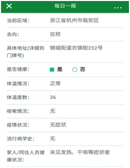 疫情严重居家期间,师生们均通过“每日一报”向学校报平安。系统自动获取学生个人基础信息,地理位置,且自动记忆上次填报内容,若后期每日一报如情况无变化,则可直接点击“登记”提交,方便师生填写的填写的同时,也确保了数据的准确性。学校可通过“每日一报”获得师生当日的所在地,体温情况,咳嗽与否以及同住人员的健康状况等做到及时监督防控。