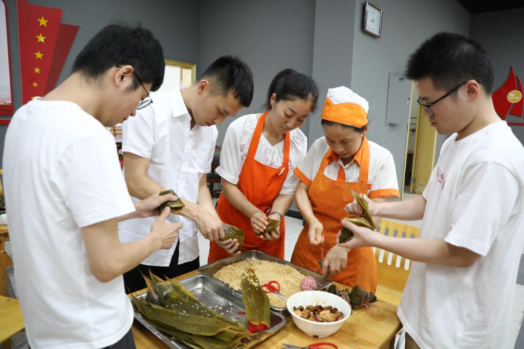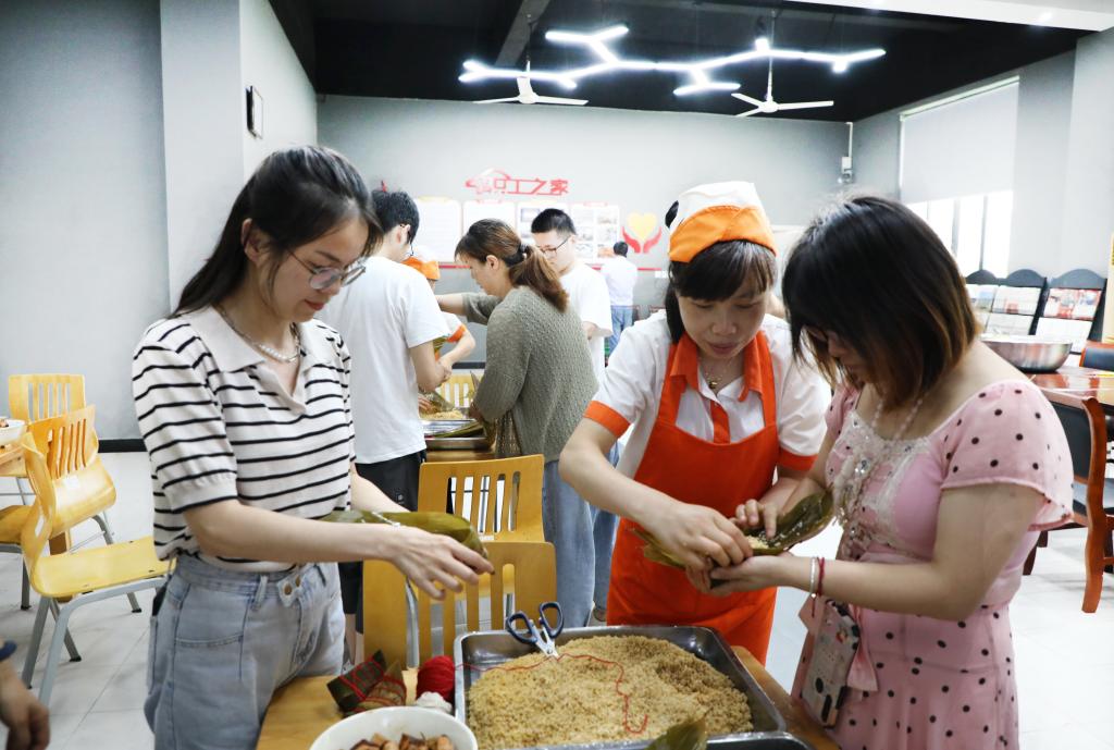 “四时花竞巧,九子粽争新”,为弘扬传统节日,传承民族文化,首先进行了包粽子活动。活动现场摆满了五花肉、咸糯米、粽叶等原材料,联谊员工以5—6人为一组,以老带新的模式开始包粽子比赛。在经验丰富的食堂阿姨的指导下,一个个造型新颖别致的创新粽子成型了。在感受到浓厚节日氛围的同时,青年员工也在不知不觉中增进了彼此的互动与了解。