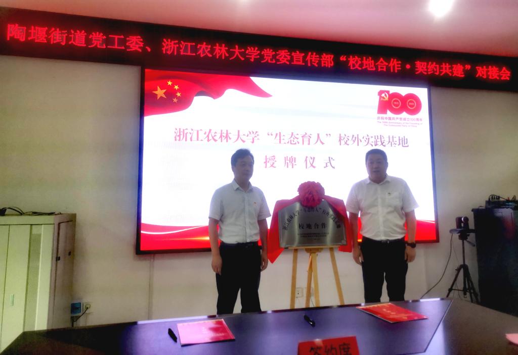 在“校地对接”研讨座谈会上,校党委委员、宣传部部长倪建均与陶堰街道党工委书记王小伟签订了“校地合作·契约共建”协议书。双方为“BEAT365英国官网文化助力乡村振兴实践基地”、“BEAT365英国官网‘生态育人’校外实践基地”揭牌。