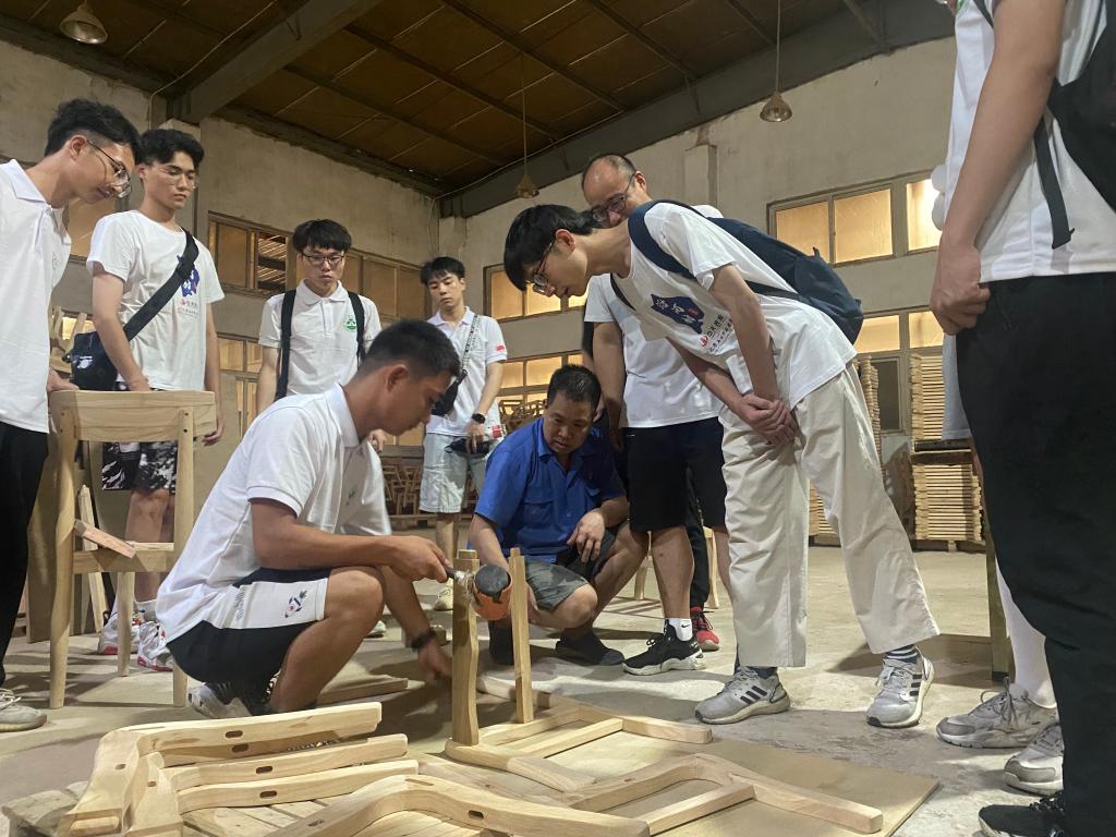 德清竹木企业发展历史悠久,企业众多。在党建共建单位浙江永辉家私有限公司,实践团与杨永连董事长进行了主题座谈,全面了解了企业发展历史、传统实木家具企业面临的困境与发展机遇,并实地考察参观了家具生产流程,动手体验家具制作。通过考察学习,同学们对所学专业增强了的信心,深刻认识到产业兴旺对乡村振兴的重要性。在沿河村广场,团队成员将学院自主研发的竹木新型材料及其产品向村民进行了展示。通过每位成员对产品的详细介绍,吸引了不少沿河村居民好奇的目光。在向居民们展示及介绍的同时,也让居民认识到了科技在提高生活品质、推动社会进步方面发挥出的巨大力量。