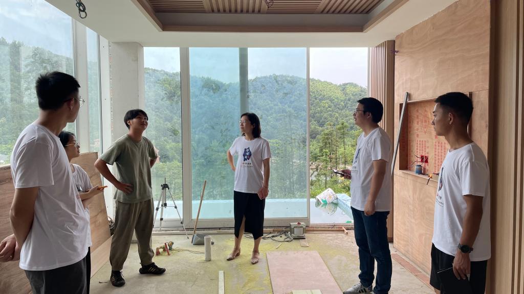 德清民宿产业优势明显,项目实践团规划将散落民房创新再设计,打造地方特色民宿。实践团拜访了德清原飨度假村有限公司董事长王立丰,实地调研了正在建设的“LV(莫干山)酒店”,全面学习了该民宿酒店的设计理念,创意来源,目标定位及未来规划,同时利用所学专业知识,与样板间工程负责人进行了交流。团队成员利用无人机技术,通过航拍视频和图片,制作规划导视图,设计了符合村庄地貌特点的竹木传统手艺展示馆、沉浸式智慧竹木坊为主体的竹木研学创新基地,探索生态观光、乡村生活、康养民宿、研学体验有效融合的民宿经济新业态,助力产业兴旺的美丽乡村建设。