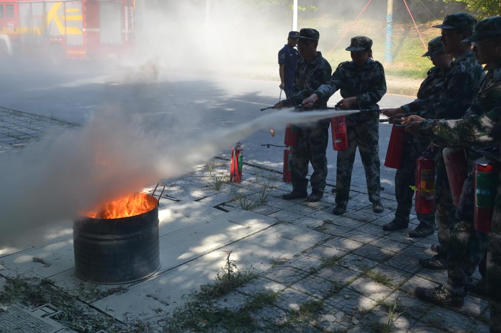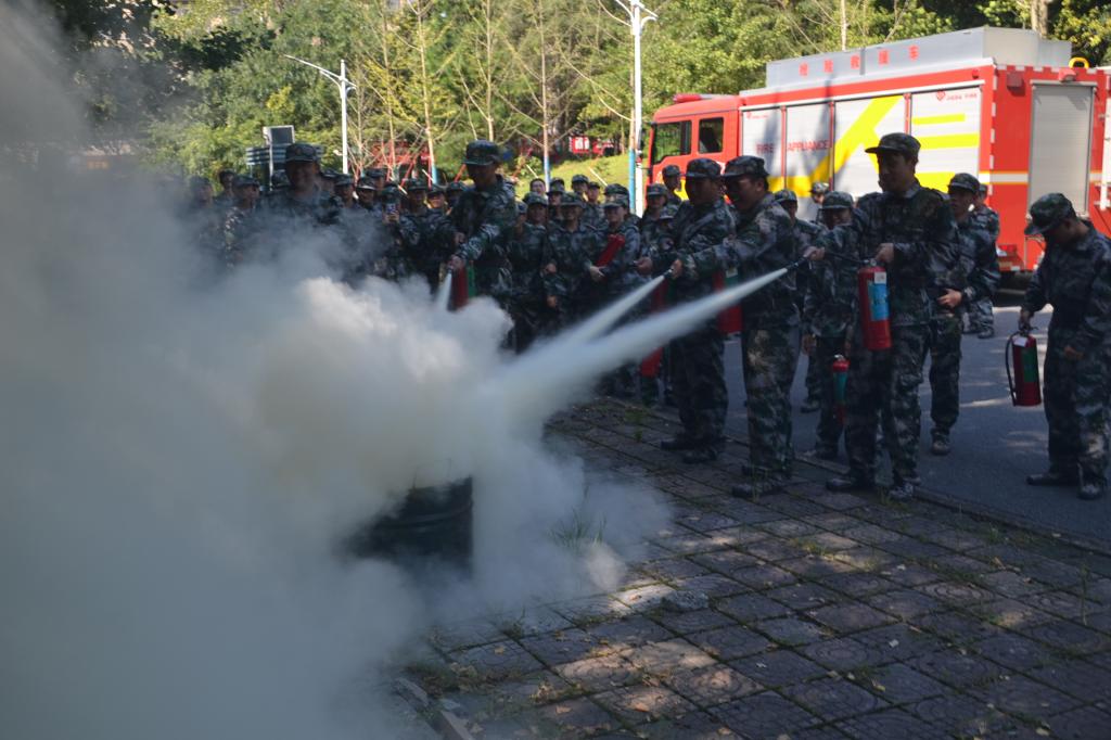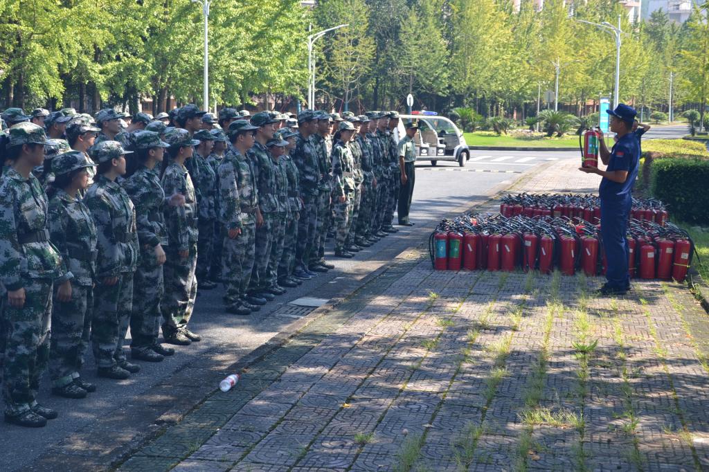 军训学生以营为单位开展灭火体验,分批拿起灭火器,体验扑救初期火灾,体验的同时,也掌握和熟识了灭火器的正确使用方法。