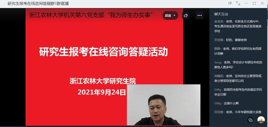 9月24日,2022年“研究生报考在线答疑活动”在钉钉群开启,本次活动由研究生院主办,研究生院相关负责人担任直播主讲人,校内各年级有意向报考研究生的同学参加活动,研究生院招生与就业办公室工作人员同步在线进行答疑。
