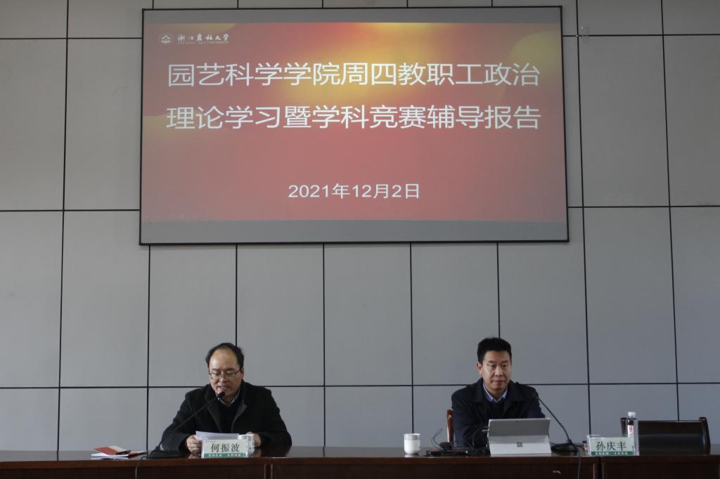 12月2日,园艺科学学院举行教职工政治理论学习暨学科竞赛辅导报告会,化材学院林业工程学科支部书记孙庆丰教授、林生院植物学科左照江教授应邀做辅导报告。园艺科学学院全体教职工和本研学生党员120余人参会,报告会由学院党委书记何振波主持。