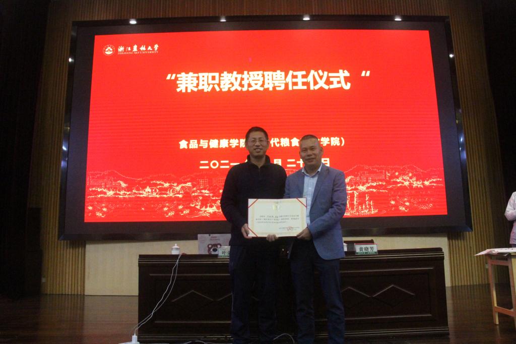 汪和生向叶剑鸿颁发“兼职教授”聘书,叶剑鸿劝勉学子们要珍惜大学时光,做一个有知识有担当的浙农林人。