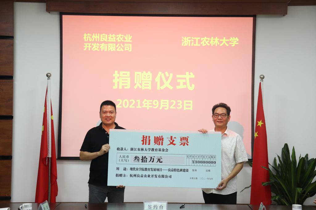 9月23日,现代农学院与杭州良益农业开发有限公司捐赠合作协议签署仪式举行。杭州良益农业开发有限公司(以下简称良益公司)董事长江于良及相关部门负责人,校友办主任杨黎明,农学院班子成员以及师生代表参加仪式。仪式由学院党委书记梁卫玲主持。