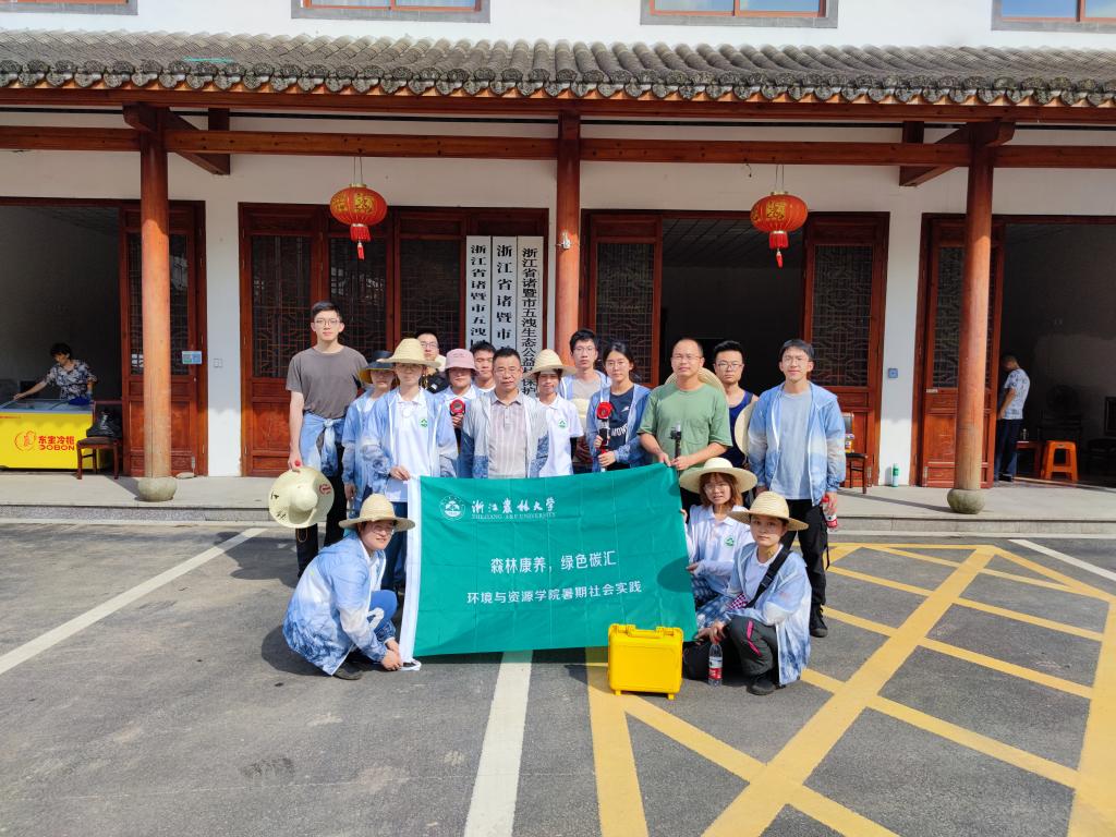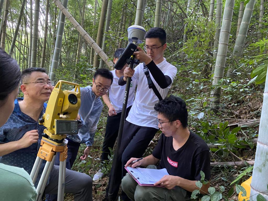在抵达诸暨五泄森林公园后,实践团通过团队指导老师施拥军教授带队、研究生指导和协助、本科生学习和实践的方式,充分利用无线传感网络、激光雷达、无人机等现代监测技术,对五泄的相关林场进行森林康养调查和森林碳汇规划设计实践调研。师生们依据生态控制的原则,主要选择了两块生长历史和立地条件基本一致、坡度相当的毛竹林样地,并进行相关的样地设置,利用全站仪进行样地位置的确定。样地设置好后,对样地进行每木检尺,获取样地内毛竹的空间地理位置、胸径大小及年龄大小,计算树木碳储量。同时,实践团还进行了样地周围土壤和植物的生物多样性测定。