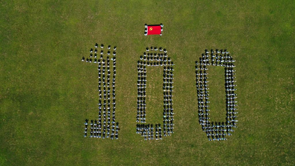 学院全体师生排成“100”的巨型字样,祝福中国共产党百年华诞生日快乐,深情表达爱党爱国情怀。全体师生党员来到大党旗下,面对鲜红的党旗举起右拳,庄重宣誓,坚定对党忠诚、永不叛党。