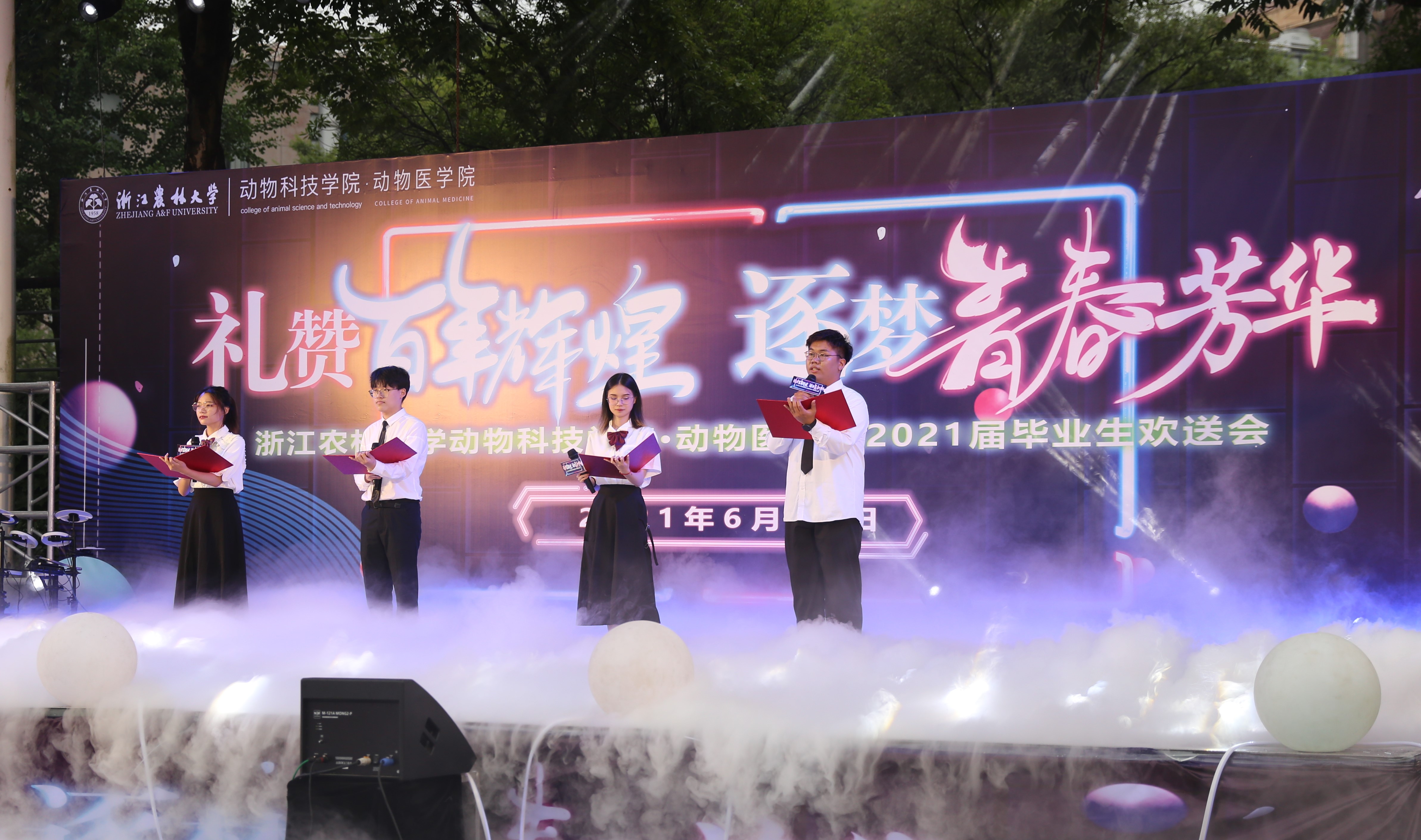 6月20日,动物科技学院·动物医学院“礼赞百年辉煌 筑梦青春芳华”2021届毕业生欢送会隆重举行。校新闻中心主任、宣传部副部长陈胜伟,学工部部长、学生处处长周晓光,化学与工程材料学院党委书记谢志新,浙江惠通农业发展有限公司董事长章叶恩及人力资源总监李长贺,浙江佳雯宠物医院管理有限公司总经理谢作缎,学院党政领导班子、全体教师,以及毕业生家长代表们和全体毕业生同学共同参加了欢送活动。