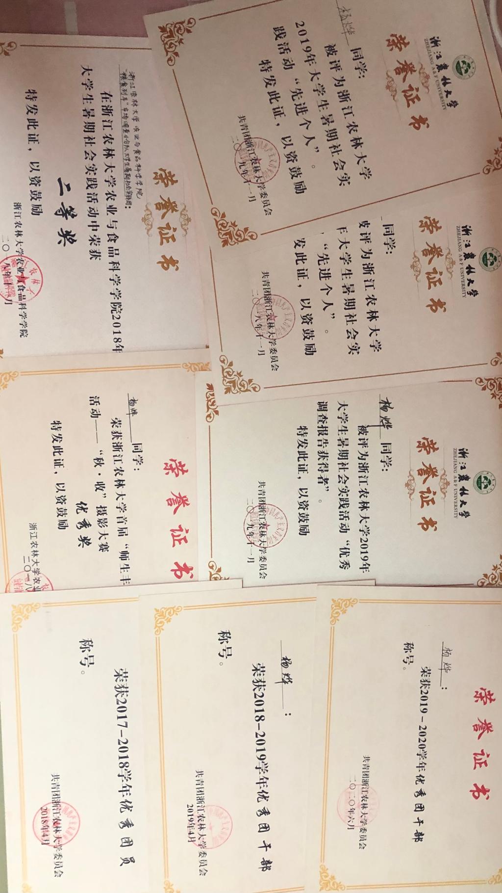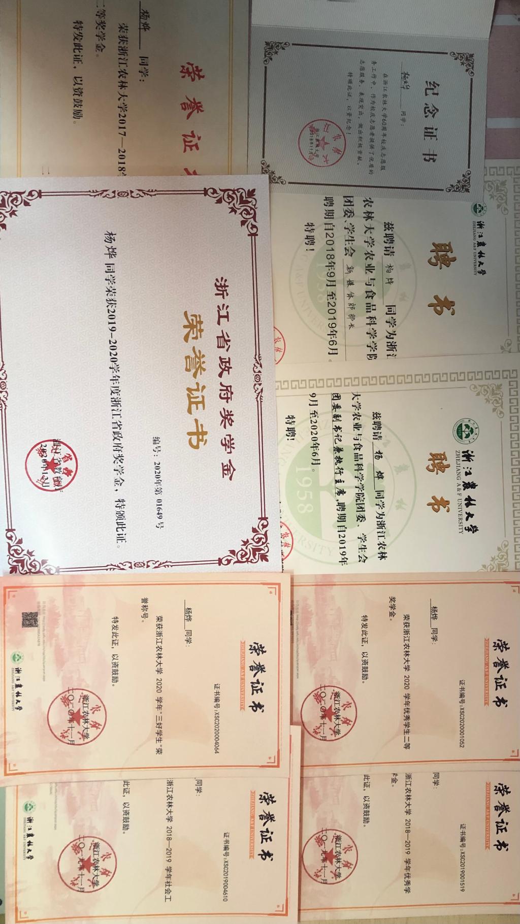 杨烨是食品科学与工程(粮油储检)171班的学生,她高中毕业于浙江省宁波市慈溪市实验高级中学。大学四年来获得极多的荣誉,在学习上,曾荣获浙江省省政府奖学金,三好学生称号,并前后多次获得校优秀学生奖学金;在社会实践上,她所参与的师生党员科技支农暑期社会实践团,荣获三等奖及十佳团队称号,多次获得了学校社会实践先进个人和“优秀调查报告获得者”称号;在学院班级工作上,她曾任班委、农学院团学团委副书记兼全媒体中心主任,荣获2017-2018学年优秀团员称号,2018-2019学年社会工作奖称号,2018-2019学年、2019-2020学年连续两学年优秀团干部称号。