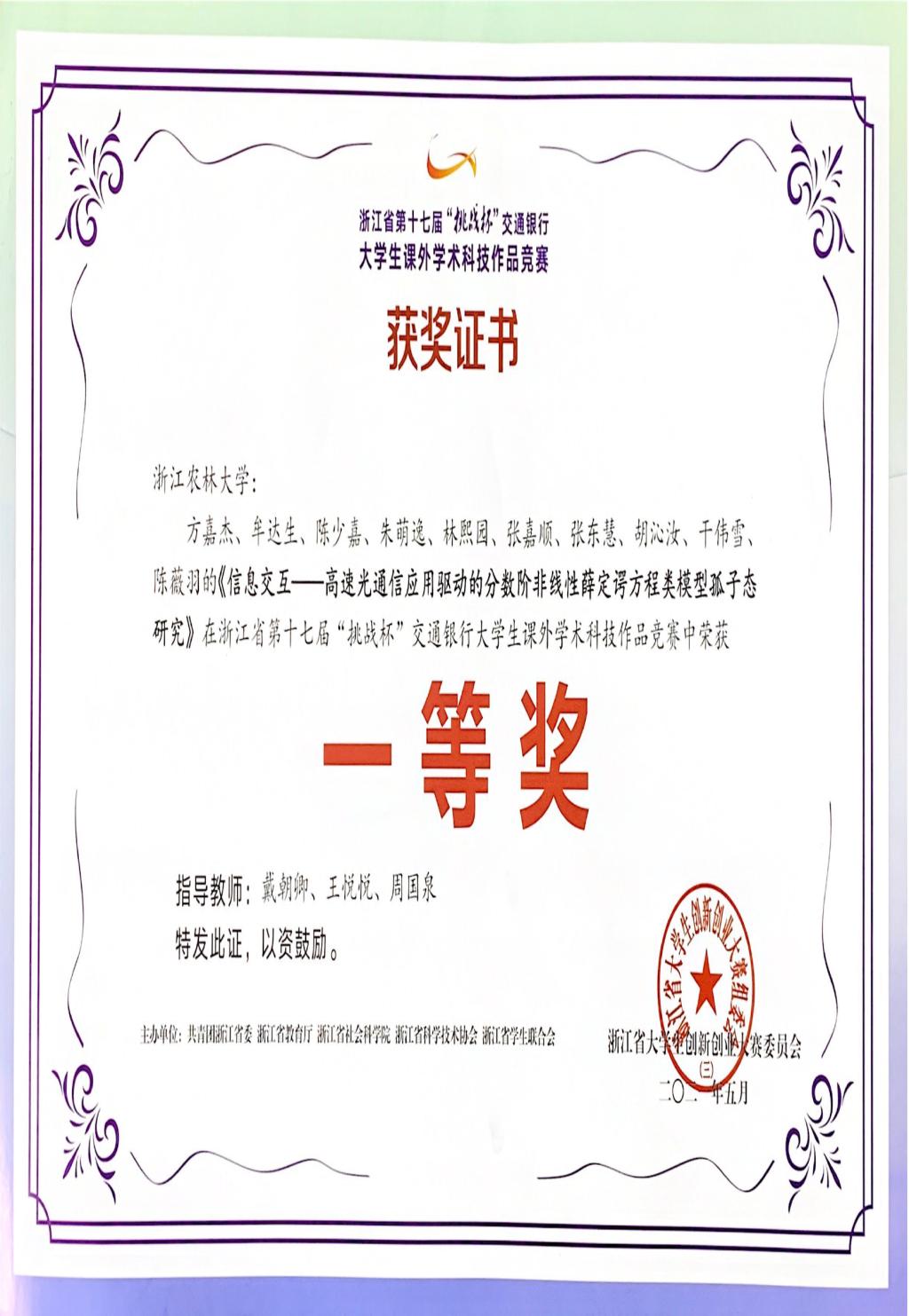 重创新、“挑战杯”科技作品竞赛荣获一等奖。支部教师注重创新教育,带领学生积极参与课外科技创新活动。2021年5月14日至16日,在第十七届“挑战杯”全国大学生课外学术科技作品竞赛浙江省选拔赛决赛中,戴朝卿教授、王悦悦副教授和周国泉教授指导的由方嘉杰、牟达生、干伟雪、朱萌逸、胡沁汝、林熙园、张东慧、张嘉顺、陈少嘉、陈薇羽等同学合作的项目《信息交互——高速光通信应用驱动的分数阶非线性薛定谔方程类模型孤子态研究》获浙江省一等奖。该项目是在戴朝卿教授团队的理论研究上进行的实践应用探索,为面向高速光通信系统应用中的信息交互提供了理论支持。