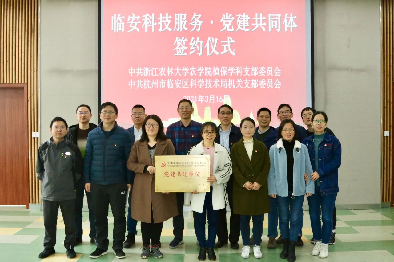3月16日,农学院植物保护学科党支部与临安区科技局机关党支部签署“临安科技服务·党建共同体”党建共建协议。农学院党委书记汪和生、学院相关代表、植物保护学科党支部党员代表,临安区科技局党组书记黄文豪、党员代表参加本次活动。