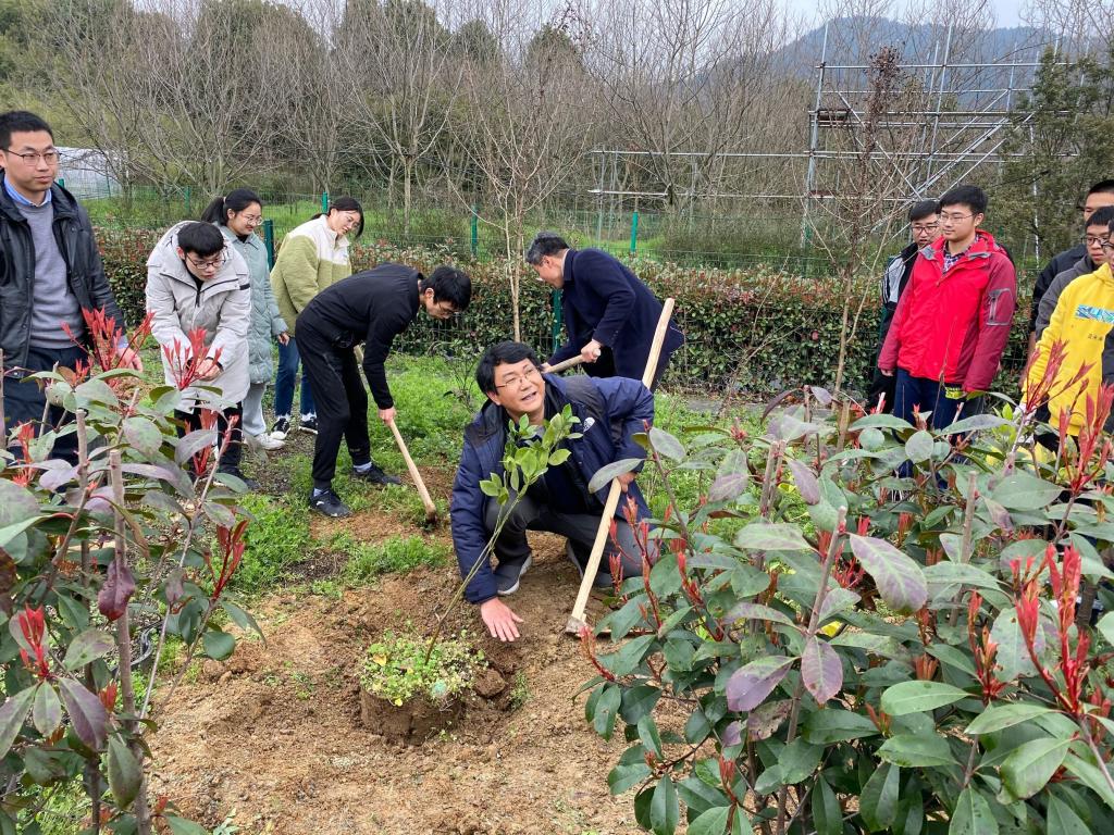 植树现场,学院党委书记郑炳松带头挥锄、挖坑培土,与师生一同为党员生态责任地添上一片新绿,师生纷纷表示体会到了种植树苗的不易和亲自栽种的快乐,数以百计的橘树、胡柚在春风中成排而立,是汗水的凝结,是成长的期盼,是希望的寄托。