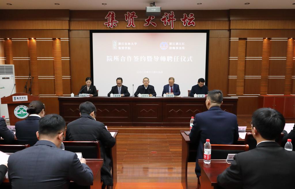 12月19日,集贤学院与浙江满江红律师事务所的院所战略合作框架协议签约暨新文科求真实验班校外导师聘任仪式举行。集贤学院院长孙伟圣、学院相关负责人,浙江满江红律师事务所主任胡志坚,党支部书记袁永明等出席签约仪式。