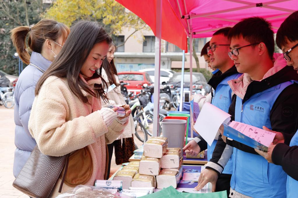 此次活动以宣传垃圾分类知识和趣味游戏相结合开展。活动伊始,同学们分别在东湖食堂、集贤食堂、西径食堂、宿舍区等场所分发垃圾分类指导手册和倡议书,用通俗易懂的语言向路过的同学讲解了垃圾分类的标准、倡议书以及有奖竞答的活动规则,引导同学们前往东湖食堂广场趣味游戏活动点参与活动。