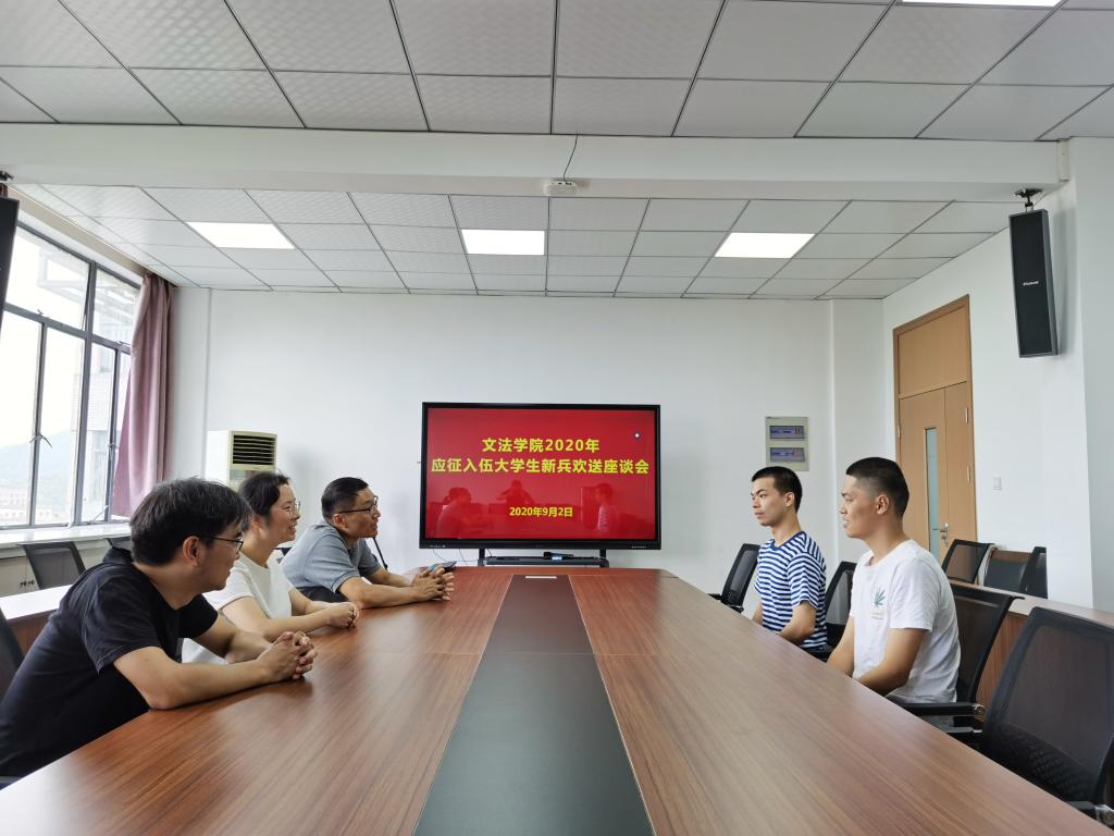 9月2日,文法学院举行2020年应征入伍大学生新兵欢送座谈会。院党委负责人、学生办主任、辅导员以及应征入伍学生、退伍复学学生代表参加了座谈会。