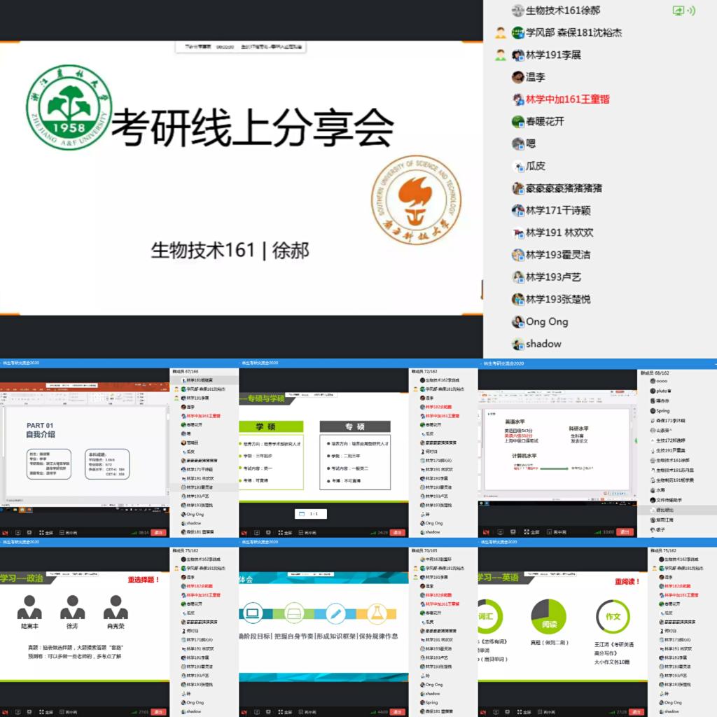 为深入推进“三全育人”综合改革试点工作,加强学院学风建设,帮助学生树立远大的学业目标,近日,林生院以线上线下相结合的方式开展“研途相伴”考研经验分享交流系列活动。各学科专业老师、成功考取研究生的毕业生以及在校本科生400余人参与活动。