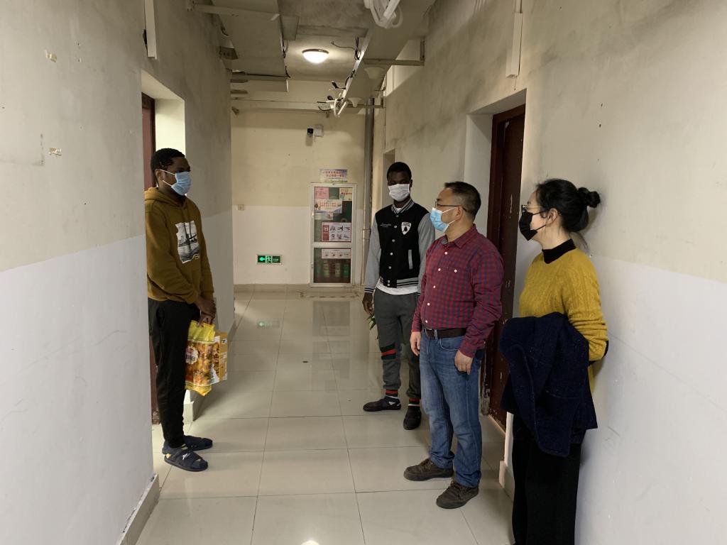 3月16日,国教学院院长赵有华、学生工作负责人在辅导员和国际交流协会成员的陪同下看望境内返校隔离国际学生,了解隔离生活情况,安抚紧张情绪,并送上慰问品。