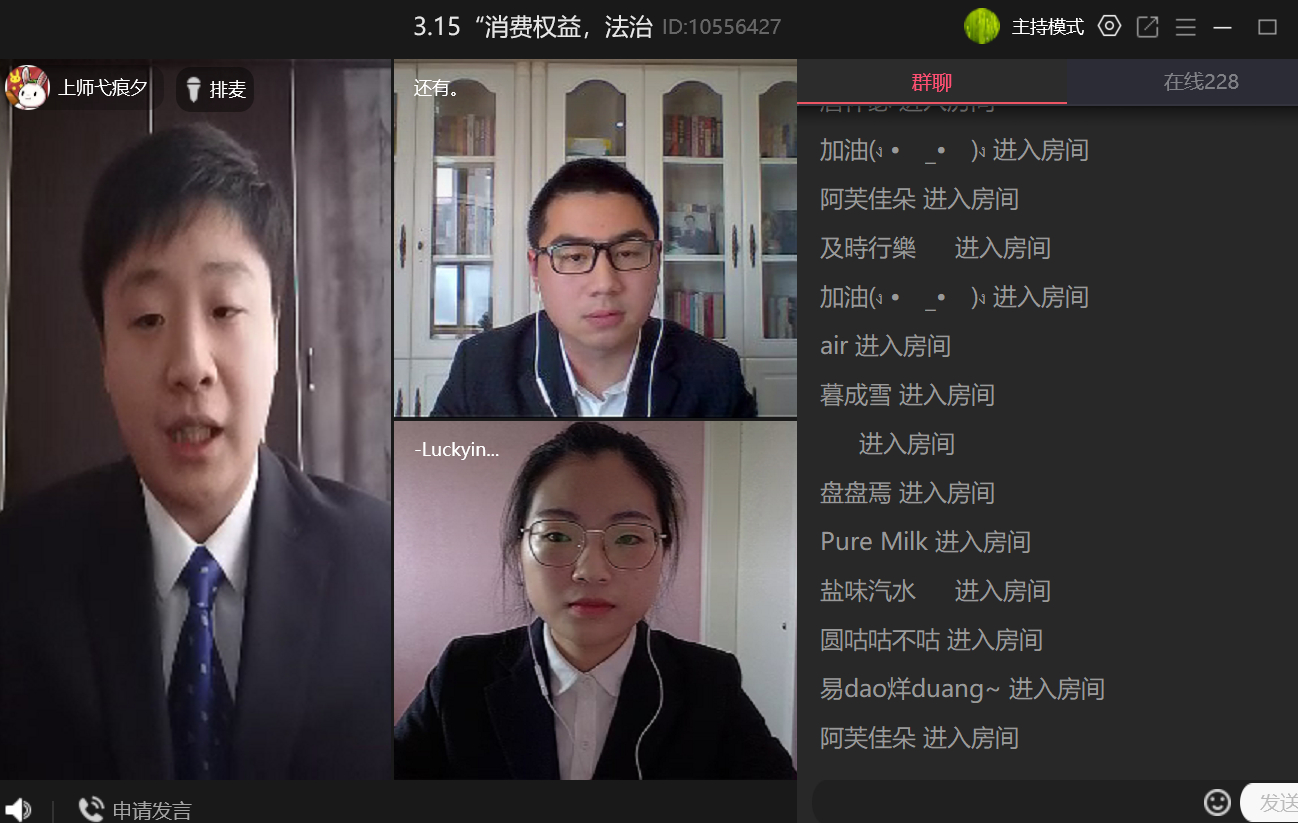 活动分为两个环节,在第一环节中主持人与法律志愿服务队的两位同学为直播间的观众们分析了四例近期侵害消费者权益的热点事件。在第二环节中,法律志愿服务队的同学与直播间的观众们进行互动,由观众提出自己所遇到的侵害消费者权益的相关问题,嘉宾在线予以讨论和解答。在这一环节中共有11位观众参与并提出自己的问题,法律志愿服务队的成员们以真诚、热情、细致、专业的态度为线上咨询的群众进行了耐心解答。直播活动全程持续了两个多小时,互动热烈。