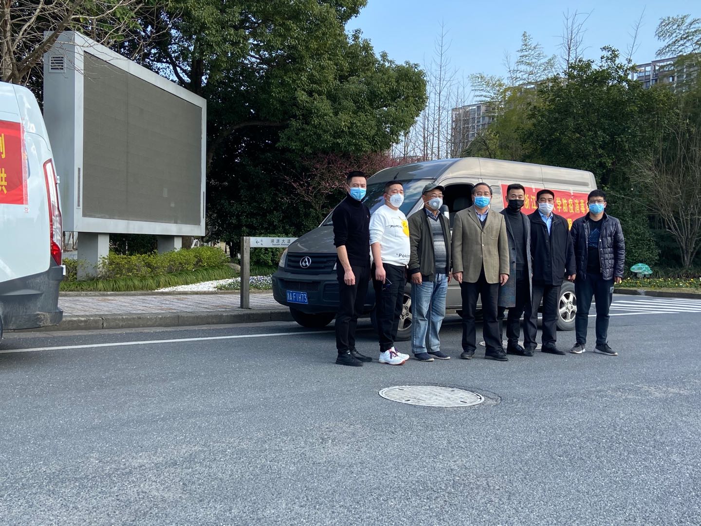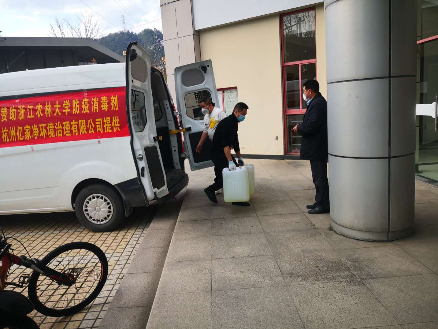 在疫情防控的关键时期, 2月24日下午,杭州亿家净环境治理有限公司企业负责人在副校长胡祖吉、相关部们负责人以及工程学院傅深渊老师的陪同下,将1吨的防疫消毒剂捐赠给学校,共同为校园防控工作亲情助力,一起守护校园平安。