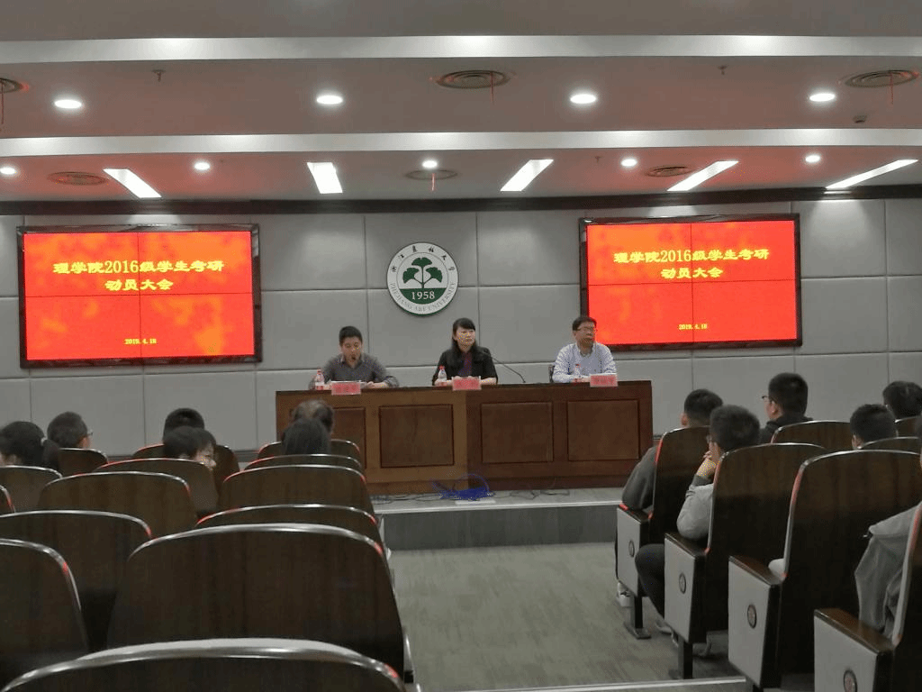 4月18日下午,理学院在图书馆第二报告厅举行2016级学生考研动员大会,学院党委书记洪昀,各专业负责人,学院年轻骨干教师代表、各班班主任、辅导员及2016级同学参加。
