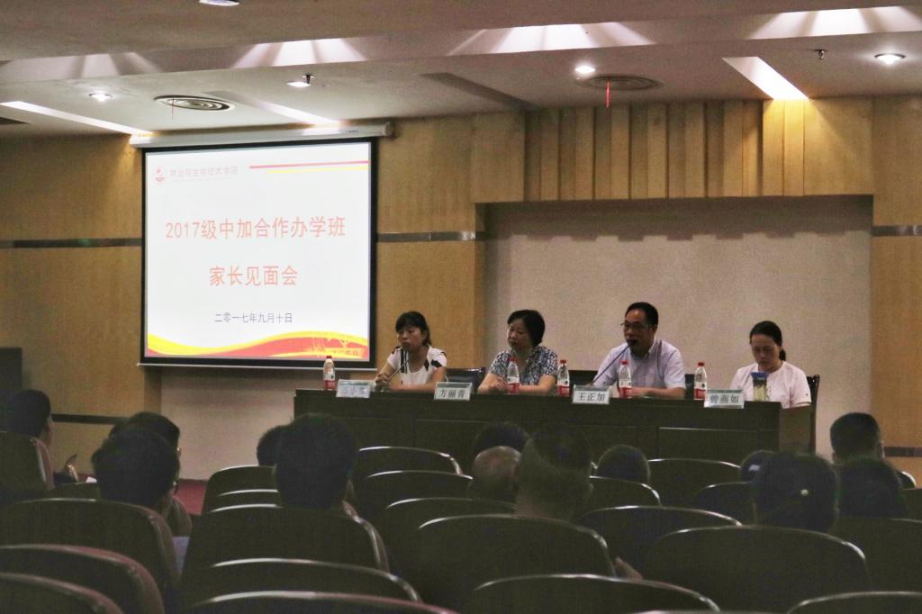 近日,2017级林学中加合作班家长见面会召开。国际处处长方丽青及专业相关负责人出席见面会。