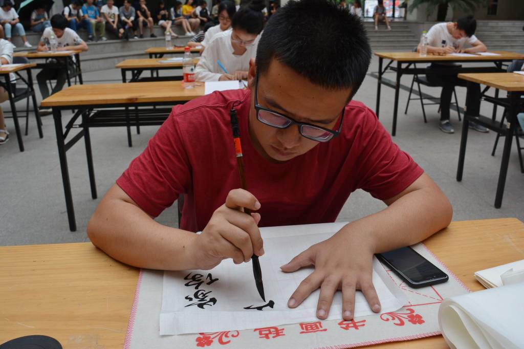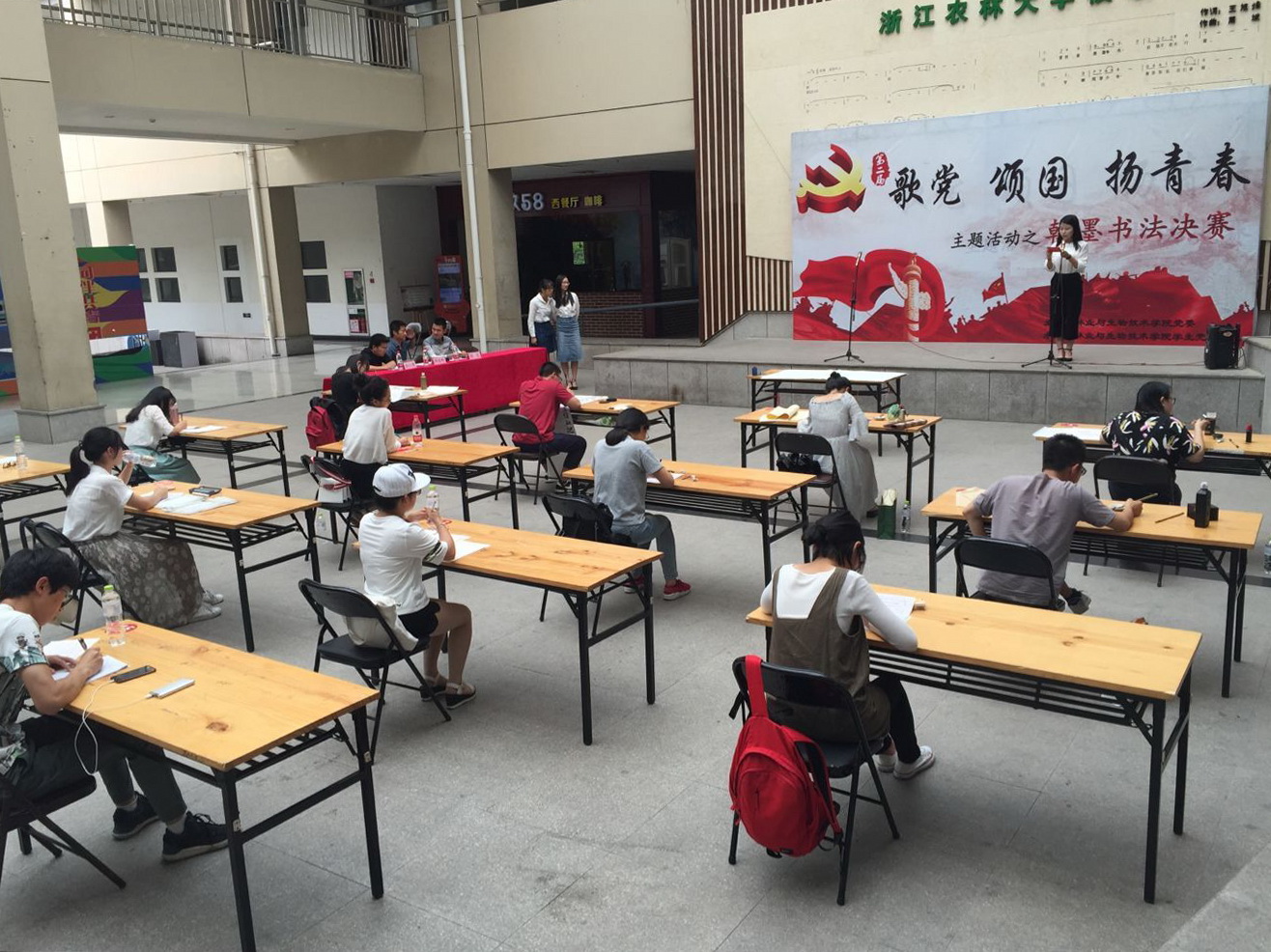 比赛开始前,学院学生党支部献上了朗诵表演。比赛中,参赛选手尽情挥洒豪情、展现书写功底,作品中有笔划遒劲、刚柔并济的隶书;有清秀、平和、书卷气浓的楷书;有工整而不失流畅的行楷;还有潇洒洋溢的草书。经过近一小时紧张比拼,包括硬笔、软笔在内的参赛选手均完成了自己的作品。