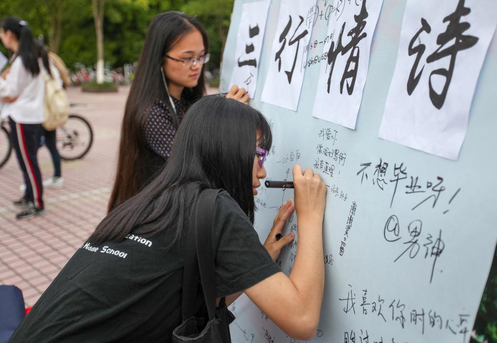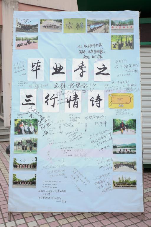 5月24日,东湖食堂门口的大型展板上被来往的师生写满了毕业留言,这些诗中,有写给朋友、给同学、给老师的,但最多的还是写给母校的三行情诗。气氛热闹,祝愿的情怀也非常浓厚,当日场面效果俱佳。