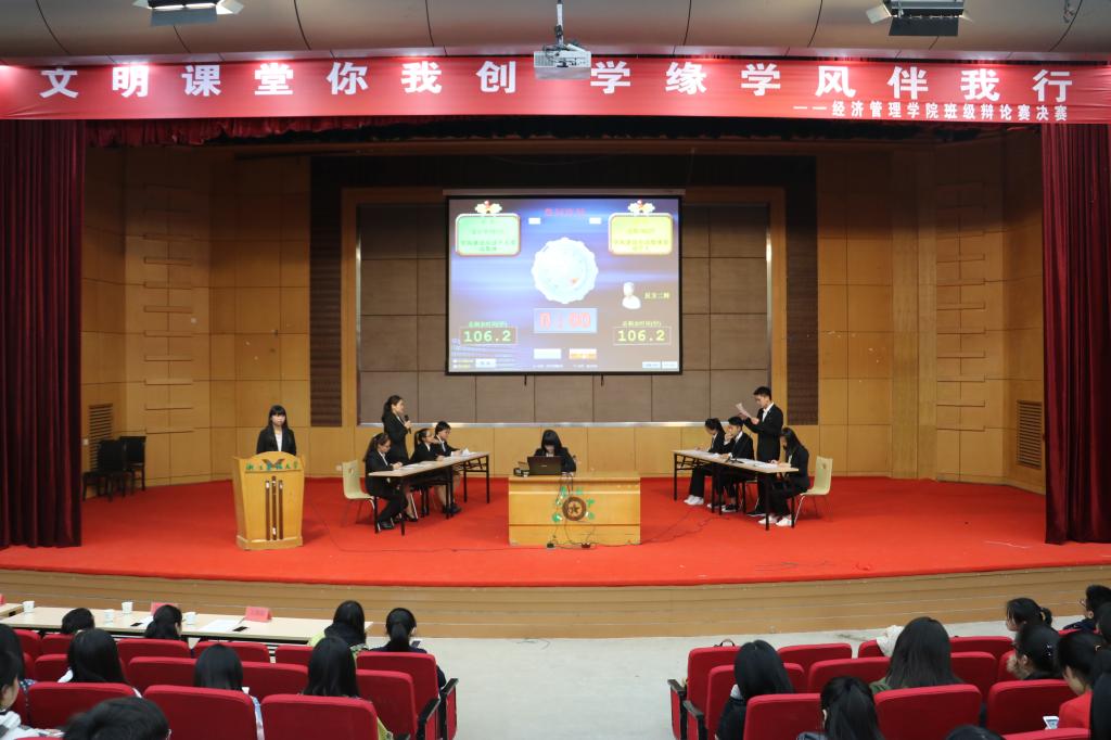 4月13日晚,经济管理学院举行“文明课堂你我创,学风建设伴我行”班级辩论赛决赛。学生办主任,校、院辩论队队长担任评委,全体大一学生到场观赛。